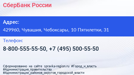 СберБанк России по адресу 429960, Чувашия, Чебоксары, 10 Пятилетки, 31 в дальнейшем Организация, размещена в следующих категориях: