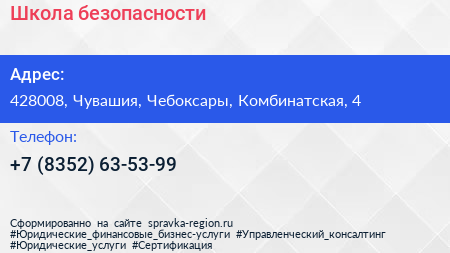 Школа безопасности по адресу 428008, Чувашия, Чебоксары, Комбинатская, 4 в дальнейшем Организация, размещена в следующих категориях: