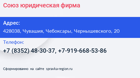 Союз, юридическая фирма по адресу 428038, Чувашия, Чебоксары, Чернышевского, 20 в дальнейшем Организация, размещена в следующих категориях: