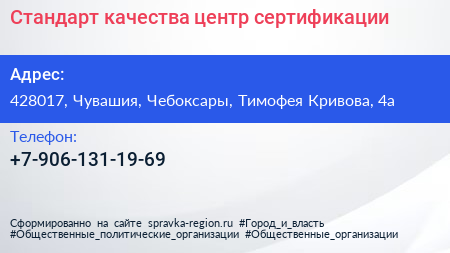 Стандарт качества, центр сертификации по адресу 428017, Чувашия, Чебоксары, Тимофея Кривова, 4а в дальнейшем Организация, размещена в следующих категориях: