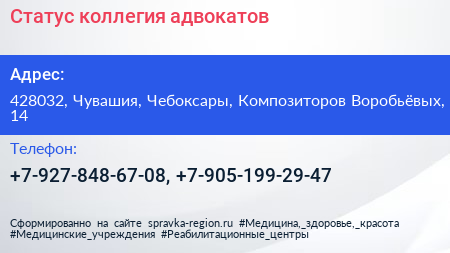Статус, коллегия адвокатов по адресу 428032, Чувашия, Чебоксары, Композиторов Воробьёвых, 14 в дальнейшем Организация, размещена в следующих категориях: