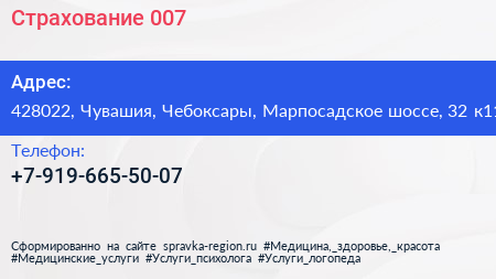 Страхование 007 по адресу 428022, Чувашия, Чебоксары, Марпосадское шоссе, 32 к11 в дальнейшем Организация, размещена в следующих категориях: