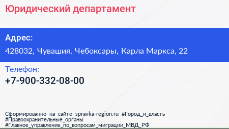 Юридический департамент по адресу 428032, Чувашия, Чебоксары, Карла Маркса, 22 в дальнейшем Организация, размещена в следующих категориях: