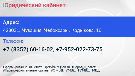 Юридический кабинет по адресу 428031, Чувашия, Чебоксары, Кадыкова, 16 в дальнейшем Организация, размещена в следующих категориях: