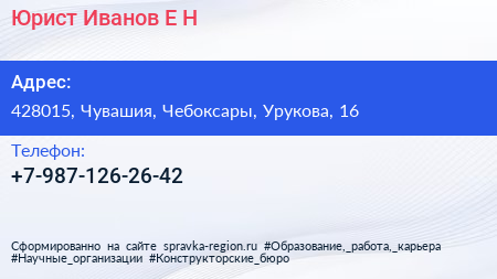 Юрист Иванов Е.Н. по адресу 428015, Чувашия, Чебоксары, Урукова, 16 в дальнейшем Организация, размещена в следующих категориях: