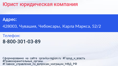 Юрист, юридическая компания по адресу 428003, Чувашия, Чебоксары, Карла Маркса, 52/2 в дальнейшем Организация, размещена в следующих категориях: