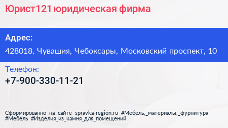 Юрист121, юридическая фирма по адресу 428018, Чувашия, Чебоксары, Московский проспект, 10 в дальнейшем Организация, размещена в следующих категориях: