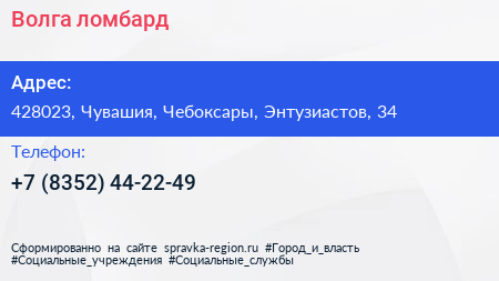 Волга ломбард по адресу 428023, Чувашия, Чебоксары, Энтузиастов, 34 в дальнейшем Организация, размещена в следующих категориях: