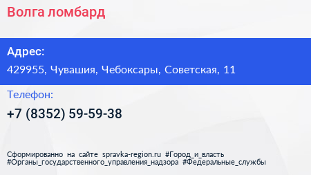 Волга ломбард по адресу 429955, Чувашия, Чебоксары, Советская, 11 в дальнейшем Организация, размещена в следующих категориях: