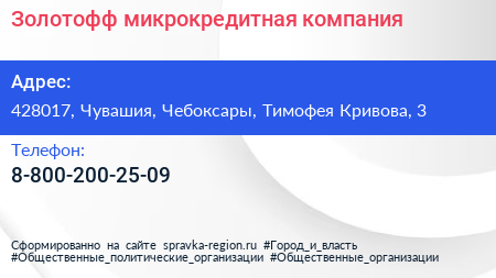 Золотофф, микрокредитная компания по адресу 428017, Чувашия, Чебоксары, Тимофея Кривова, 3 в дальнейшем Организация, размещена в следующих категориях:
