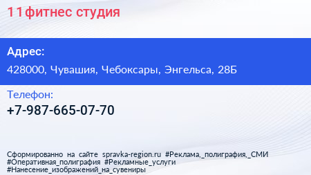 1+1, фитнес-студия по адресу 428000, Чувашия, Чебоксары, Энгельса, 28Б в дальнейшем Организация, размещена в следующих категориях: