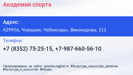 Академия спорта по адресу 429956, Чувашия, Чебоксары, Винокурова, 111 в дальнейшем Организация, размещена в следующих категориях: