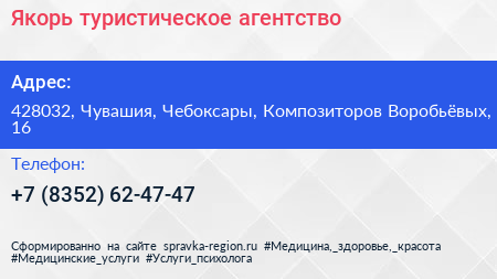 Якорь, туристическое агентство по адресу 428032, Чувашия, Чебоксары, Композиторов Воробьёвых, 16 в дальнейшем Организация, размещена в следующих категориях: