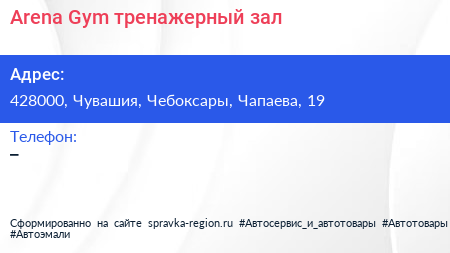 Arena Gym, тренажерный зал по адресу 428000, Чувашия, Чебоксары, Чапаева, 19 в дальнейшем Организация, размещена в следующих категориях: