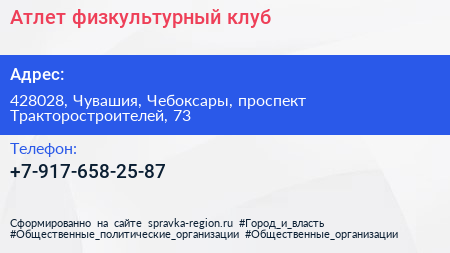 Атлет, физкультурный клуб по адресу 428028, Чувашия, Чебоксары, проспект Тракторостроителей, 73 в дальнейшем Организация, размещена в следующих категориях: