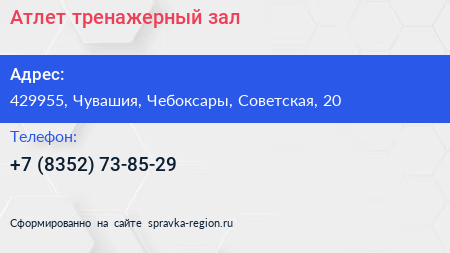 Атлет, тренажерный зал по адресу 429955, Чувашия, Чебоксары, Советская, 20 в дальнейшем Организация, размещена в следующих категориях: