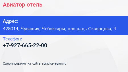 Авиатор, отель по адресу 428014, Чувашия, Чебоксары, площадь Скворцова, 4 в дальнейшем Организация, размещена в следующих категориях: