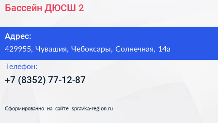 Бассейн, ДЮСШ №2 по адресу 429955, Чувашия, Чебоксары, Солнечная, 14а в дальнейшем Организация, размещена в следующих категориях: