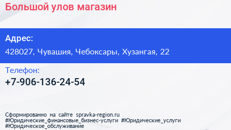 Большой улов, магазин по адресу 428027, Чувашия, Чебоксары, Хузангая, 22 в дальнейшем Организация, размещена в следующих категориях: