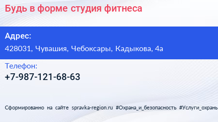 Будь в форме, студия фитнеса по адресу 428031, Чувашия, Чебоксары, Кадыкова, 4а в дальнейшем Организация, размещена в следующих категориях:
