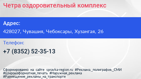 Четра, оздоровительный комплекс по адресу 428027, Чувашия, Чебоксары, Хузангая, 26 в дальнейшем Организация, размещена в следующих категориях:
