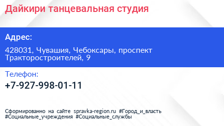 Дайкири, танцевальная студия по адресу 428031, Чувашия, Чебоксары, проспект Тракторостроителей, 9 в дальнейшем Организация, размещена в следующих категориях: