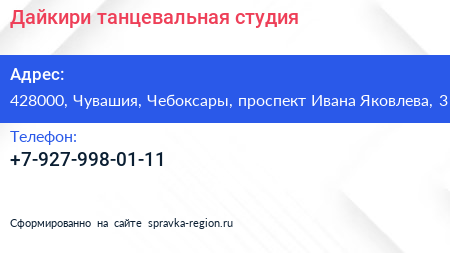 Дайкири, танцевальная студия по адресу 428000, Чувашия, Чебоксары, проспект Ивана Яковлева, 3 в дальнейшем Организация, размещена в следующих категориях: