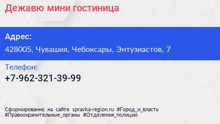 Дежавю, мини-гостиница по адресу 428005, Чувашия, Чебоксары, Энтузиастов, 7 в дальнейшем Организация, размещена в следующих категориях: