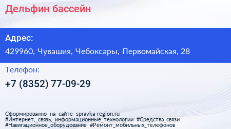 Дельфин, бассейн по адресу 429960, Чувашия, Чебоксары, Первомайская, 28 в дальнейшем Организация, размещена в следующих категориях: