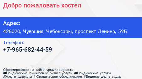 Добро пожаловать, хостел по адресу 428020, Чувашия, Чебоксары, проспект Ленина, 59Б в дальнейшем Организация, размещена в следующих категориях: