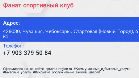 Фанат, спортивный клуб по адресу 428030, Чувашия, Чебоксары, Стартовая (Новый Город), 6 к1 в дальнейшем Организация, размещена в следующих категориях: