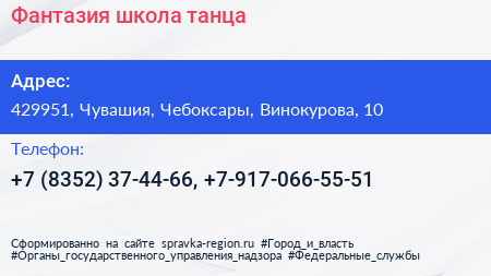 Фантазия, школа танца по адресу 429951, Чувашия, Чебоксары, Винокурова, 10 в дальнейшем Организация, размещена в следующих категориях: