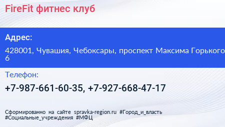 FireFit, фитнес-клуб по адресу 428001, Чувашия, Чебоксары, проспект Максима Горького, 6 в дальнейшем Организация, размещена в следующих категориях: