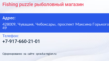 Fishing puzzle, рыболовный магазин по адресу 428009, Чувашия, Чебоксары, проспект Максима Горького, 49 в дальнейшем Организация, размещена в следующих категориях: