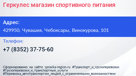 Геркулес, магазин спортивного питания по адресу 429950, Чувашия, Чебоксары, Винокурова, 101 в дальнейшем Организация, размещена в следующих категориях:
