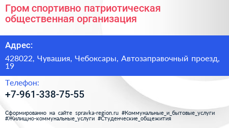 Гром, спортивно-патриотическая общественная организация по адресу 428022, Чувашия, Чебоксары, Автозаправочный проезд, 19 в дальнейшем Организация, размещена в следующих категориях: