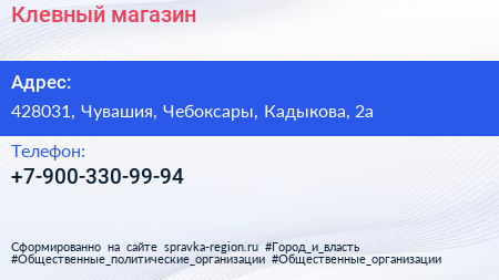 Клевный, магазин по адресу 428031, Чувашия, Чебоксары, Кадыкова, 2а в дальнейшем Организация, размещена в следующих категориях: