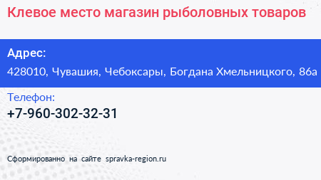 Клевое место, магазин рыболовных товаров по адресу 428010, Чувашия, Чебоксары, Богдана Хмельницкого, 86а в дальнейшем Организация, размещена в следующих категориях: