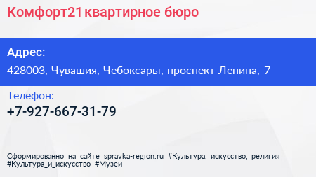 Комфорт21, квартирное бюро по адресу 428003, Чувашия, Чебоксары, проспект Ленина, 7 в дальнейшем Организация, размещена в следующих категориях: