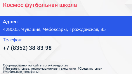 Космос, футбольная школа по адресу 428005, Чувашия, Чебоксары, Гражданская, 85 в дальнейшем Организация, размещена в следующих категориях: