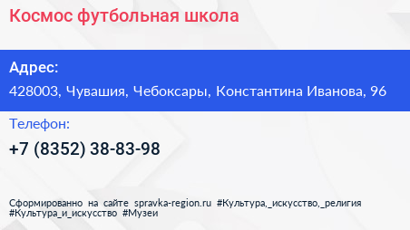 Космос, футбольная школа по адресу 428003, Чувашия, Чебоксары, Константина Иванова, 96 в дальнейшем Организация, размещена в следующих категориях: