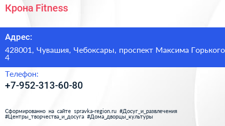 Крона Fitness по адресу 428001, Чувашия, Чебоксары, проспект Максима Горького, 4 в дальнейшем Организация, размещена в следующих категориях: