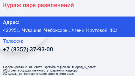 Кураж, парк развлечений по адресу 429951, Чувашия, Чебоксары, Жени Крутовой, 10а в дальнейшем Организация, размещена в следующих категориях: