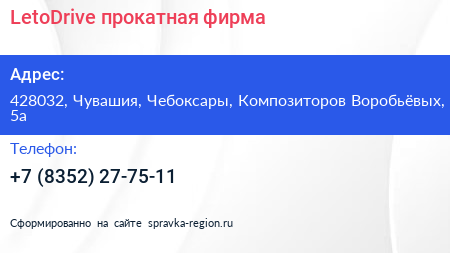 LetoDrive, прокатная фирма по адресу 428032, Чувашия, Чебоксары, Композиторов Воробьёвых, 5а в дальнейшем Организация, размещена в следующих категориях: