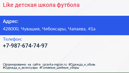 Like, детская школа футбола по адресу 428000, Чувашия, Чебоксары, Чапаева, 41а в дальнейшем Организация, размещена в следующих категориях: