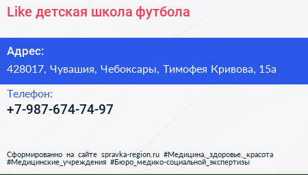 Like, детская школа футбола по адресу 428017, Чувашия, Чебоксары, Тимофея Кривова, 15а в дальнейшем Организация, размещена в следующих категориях: