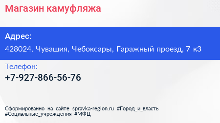 Магазин камуфляжа по адресу 428024, Чувашия, Чебоксары, Гаражный проезд, 7 к3 в дальнейшем Организация, размещена в следующих категориях: