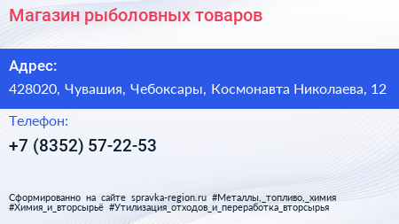 Магазин рыболовных товаров по адресу 428020, Чувашия, Чебоксары, Космонавта Николаева, 12 в дальнейшем Организация, размещена в следующих категориях: