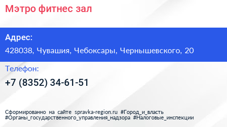 Мэтро, фитнес-зал по адресу 428038, Чувашия, Чебоксары, Чернышевского, 20 в дальнейшем Организация, размещена в следующих категориях:
