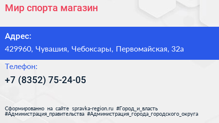 Мир спорта, магазин по адресу 429960, Чувашия, Чебоксары, Первомайская, 32а в дальнейшем Организация, размещена в следующих категориях: